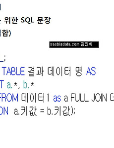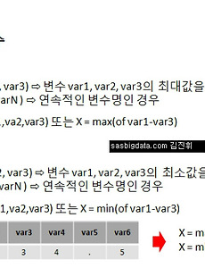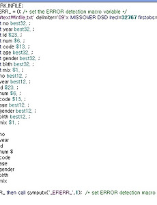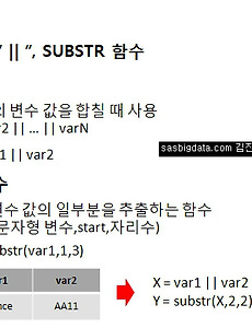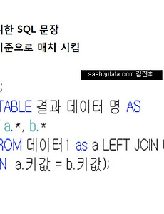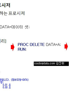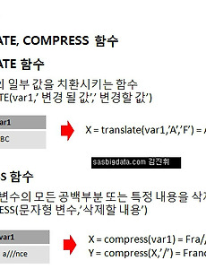 SAS105 [SAS] sas translate, compress 함수 sas에서 관측값의 일부분을 수정 치환 시켜주는 함수인 translate와 관측값의 모든 공백부분과 특정 내용을 삭제해 주는 함수인 compress에 대해서 알아보자. sas의 translate는 값의 일부분을 변경해 주는데 만약 위의 예와 달리 var1이 FBC가 아닌 FFC라면 x=translate(var1,'A','F')를 사용하면 모든 F값을 A로 치환시켜버린다. 그러므로 ABC 맨앞자리만 변환되는 것이 아닌 FFC일 경우 AAC로 치환되는 것이다. compress같은 경우 보통 데이터를 ||로 결합하면 공백들이 생기는 경우가 있는데 이경우 compress를 같이 사용 자주 사용한다. 위의 예제 처럼 모든 공백도 제거가 가능하며 '' 안에 원하는 조건을 넣으면 그부분을 제거하면서 공백도 제거하는 .. 2014. 3. 17. [SAS] sas 변수결합 ||, substr 함수 sas에서 2개 이상의 변수 값을 합칠 때 사용되는 함수 || 와 문자형 변수 값의 일부분을 추출하는 substr 함수에 대해서 알아보자. 위의 사진 참조 관측값들을 결합할 때 ||를 사용하여 값을 붙이는데 예를 들어 변수 var1에 abc가 있고 var2에 초콜렛 이 있다고 가정하자 x=var1||var2 를 적용하면 x값은 abc초콜렛 이라는 값을 가지게 되는 것이다. 주의해야 될 점은 두개의 값을 결합하는 과정에서 공백이 생길 수가 있다는 것이다. 그렇기 때문에 깔끔하게 공백없이 데이터를 결합하고 싶을때 문자형 변수의 공백을 제거해주는 compress함수를 같이 많이 사용한다. substr은 문자형 변수값의 일부분을 추출하는데 사용된다. 수치형 자료일 경우는 아무것도 추출되지 않으며, 문자형으로 변.. 2014. 3. 17. [SAS] sas 최대값(max), 최소값(min) 함수를 이용해서 구하기 평균(mean)포함 sas에서 간단하게 함수를 이용해 최대값(max), 최소값(min)을 구하는 방법을 알아보자. 최대값과 최소값 max,min을 구하는 방법은 어렵지 않다. 위의 사진을 참조한다면 간단하게 구할 수가 있다. 평균 또한 위와 같은 방법으로 mean을 사용하면 간단하게 구할 수가 있다. 여기서 추가적으로 하고 싶은 말은 만약 여러개의 변수명들이 일정한 규칙을 가지고 있다면 굳이 변수명을 일일이 나열할 필요가 없다는 것이다. 위의 예처럼 변수명들이 var1부터 순차적으로 var6 으로 구성되어 있다면 of var1-var6을 해도 변수들을 var1부터 var6까지 일일이 입력한 결과와 같다는 것이다. 만약 시작되는 변수명이 var1이라 아니라 var 또는 var0라면?? of var-var6 of var0-va.. 2014. 3. 17. [SAS] sas proc step proc delete 프로시저로 데이터셋 삭제하는 방법 sas에서 proc delete를 이용하여 데이터셋을 삭제하는 방법을 알아보자. 그냥 탐색기에서 delete키를 이용하여 삭제해도 되고, 따로 라이브러리를 지정한 곳에 가서 sas dataset을 삭제해도 된다. 그래도 뭐 모르는거보다 아는게 좋은 거니깐 어려운 것도 아니고 간지나게 데이터셋을 확장편집기에서 구문을 이용해 지우는 것이다.ㅋㅋ 위의 사진을 참조하면 쉽게 이해 할 수 있듯이 proc delete data=지우고 싶은 데이터 셋; run; 을 실행하면 원하는 데이터셋을 간단하게 삭제 할 수가 있다. 만약 데이터셋이 많고, 데이터셋명이 거의 다 비슷비슷해서 찾아서 지우기 어려울 경우 proc delete를 이용해 클릭해가며 찾지 않고 쉽게 지울때 간혹 사용이 된다. sasbigdata.com 김진휘 2014. 3. 17. [SAS] sas proc sql 변수들 합계구하기 sas proc sql 변수들 합계구하기 data ace; input a b c; cards; 1 2 3 2 2 2 100 900 500 ; run; proc sql; create table test as select sum(a, b, c) as abc_sum from ace; quit; run; 위의 코딩처럼 할 경우 결과데이터셋에 합한 결과 값 변수만 나타난다. 기존의 데이터셋에 있는 변수 모두와 결과 변수를 함께 나타나고 싶을 경우에는 아래와 같이 한다. data ace; input a b c; cards; 1 2 3 2 2 2 100 900 500 ; run; proc sql; create table test as select *, sum(a, b, c) as abc_sum from ace; qu.. 2014. 3. 14. [SAS] sas proc sql 그룹별 합계구하기 /*sas proc sql로 그룹별 합계구하기*/ data a; input key cost; cards; 111 1 222 2 333 3 222 2 111 1 111 1 333 3 444 4 ; run; /*key변수를 그룹으로 cost의 합계를 구하는 sql문*/ proc sql; create table a1 as select key, sum(cost) as sum from a group by key; quit; run; www.sasbigdata.com 김진휘 2014. 3. 14. [SAS] sas proc sql full join(합집합) 방법 sas에서 proc sql문을 이용해서 데이터를 결합하는 방법들을 알아보자. sas proc sql full join(합집합 결합) 방법 - 두개의 데이터셋에 조인키의 같은 값이 있는 경우 합집합으로 매치시켜 합치기 [sas proc sql full join 문장구조 설명] [sas proc sql full join 예제 설명] [쉽게 코딩을 알아보자] proc sql; create table 결과데이터셋 as select 임의의명.*(모든변수사용), 임의의명2.*(모든변수사용) from 합칠데이터1 as 임의의명 full join 합칠데이터2 as 임의의명2 on 임의의명.합칠데이터1의 조인키변수=임의의명2.합칠데이터2의 조인키변수; run; www.sasbigdata.com 김진휘 2014. 3. 14. [SAS] sas proc sql right join(오른쪽 테이블 기준 결합) 방법 sas에서 proc sql문을 이용해서 데이터를 결합하는 방법들을 알아보자. sas proc sql right join(오른쪽 테이블 기준 결합) 방법 - 두개의 데이터셋에 조인키의 같은 값이 있는 경우 오른쪽 테이블을 기준으로 매치시켜 합치기 [sas proc sql right join 문장구조 설명] [sas proc sql right join 예제 설명] [쉽게 코딩을 알아보자] proc sql; create table 